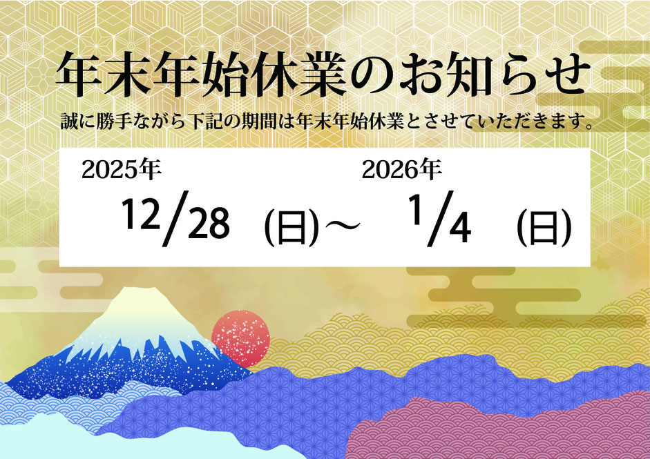 お知らせ 年末年始休業日のお知らせ 2025年12月25日 by twadmin ●年末年始休業のご案内 2025年12月28日(日)から2026年1月4日(日)までの間は年末年始休業のため、出荷業務・窓口業務(電話・メール等)をお休みさせていただきます。インターネットでのお問い合わせは、上記期間中も24時間受け付けしております。恐れ入りますが、ご了承くださいますようよろしくお願いいたします。